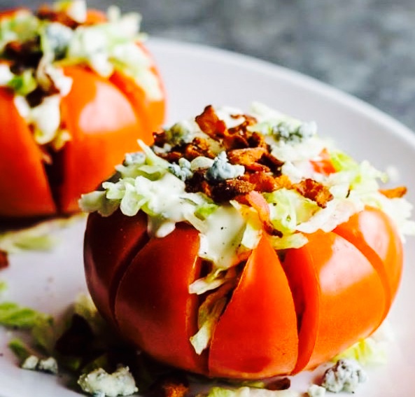 • Slice the top off the tomatoes and scoop out all the pulp. Place in a baking dish.