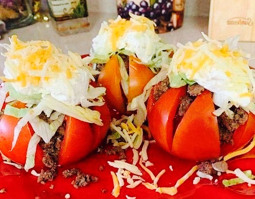 • Stuff the tomatoes with the beef mixture. Use any leftover beef in the bottom of the baking dish.