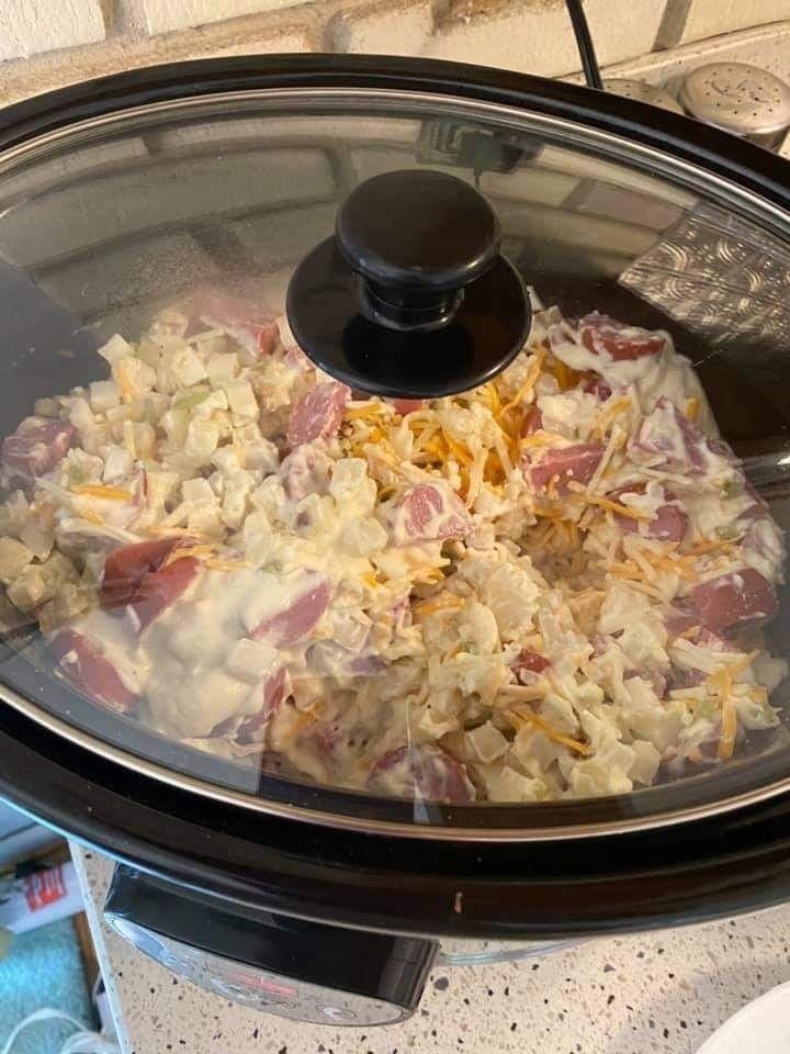 put meat, hash brown, onion and cheese in a greased slow cooker.. then mix soup, milk, sour cream together… I add things like salt and pepper, minced garlic, onion powder to the mixture if you want. then pour over kielbasa etc. then sprinkle about 1/2 cup more cheese on top.. cook on low for 6 hours or high for about 3-4 hours.. serve with salad, or roasted veggies for a complete meal… if your feeling super fatty, then serve with Texas garlic toast