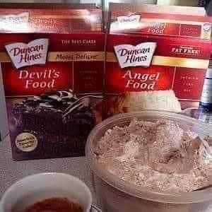 You need two boxes of cake mix. One can be any flavor you prefer, but the other MUST be Angel Food cake mix.