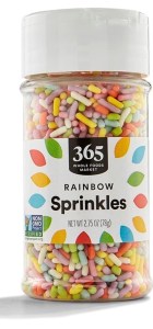Any edible rainbow sprinkles can be used. My favorite are the β365 Rainbow Sprinklesβ from Whole Foods. I will update the post with a photo at the bottom β€οΈ