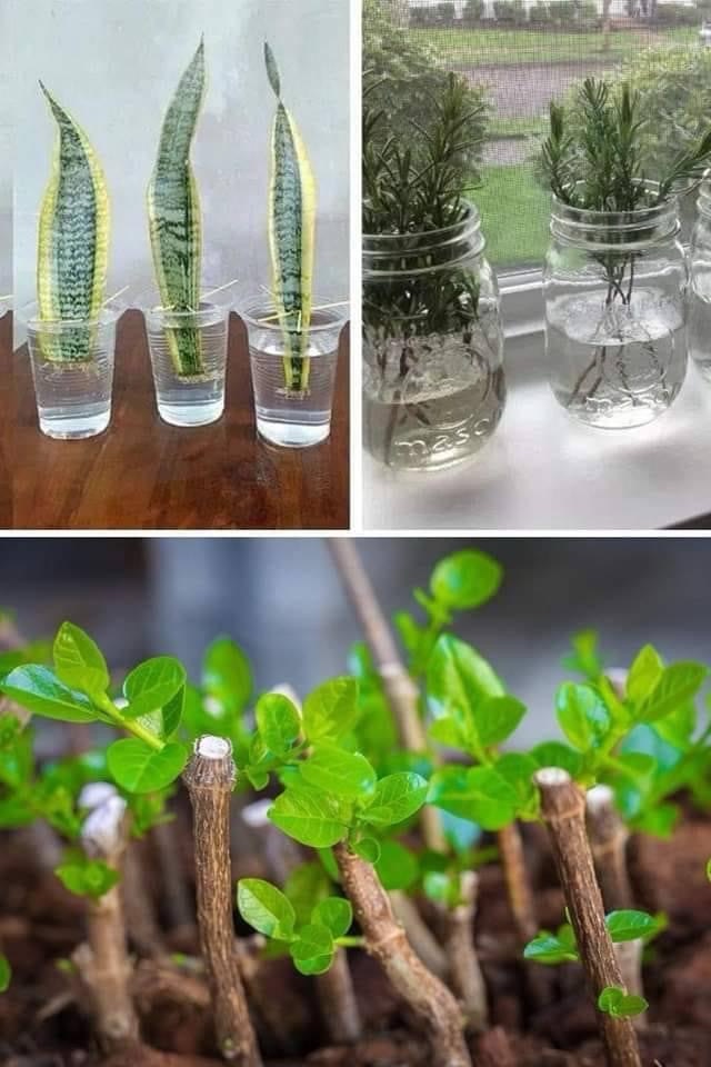 - Rose: 6-8 inch cutting, remove lower leaves, plant in soil, cover with plastic.