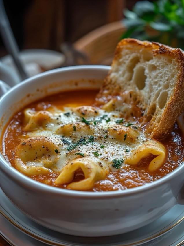 Slow Cooker Tomato Tortellini Soup with Cheddar and Toast Bites 🧀🍅